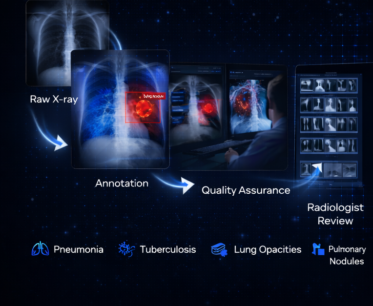 To meet the client’s requirement for large-scale and clinically reliable data, Dserve AI designed a custom end-to-end medical annotation workflow tailored specifically for lung X-ray imaging projects. The pipeline was built to handle high data volumes while maintaining strict medical accuracy and compliance at every stage.