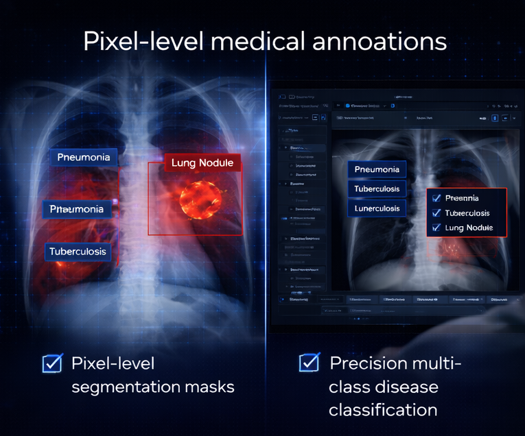 Get access to expert-annotated medical datasets to evaluate quality, accuracy, and clinical relevance before starting your project. Submit the form and our team will share curated lung X-ray samples along with dataset documentation.